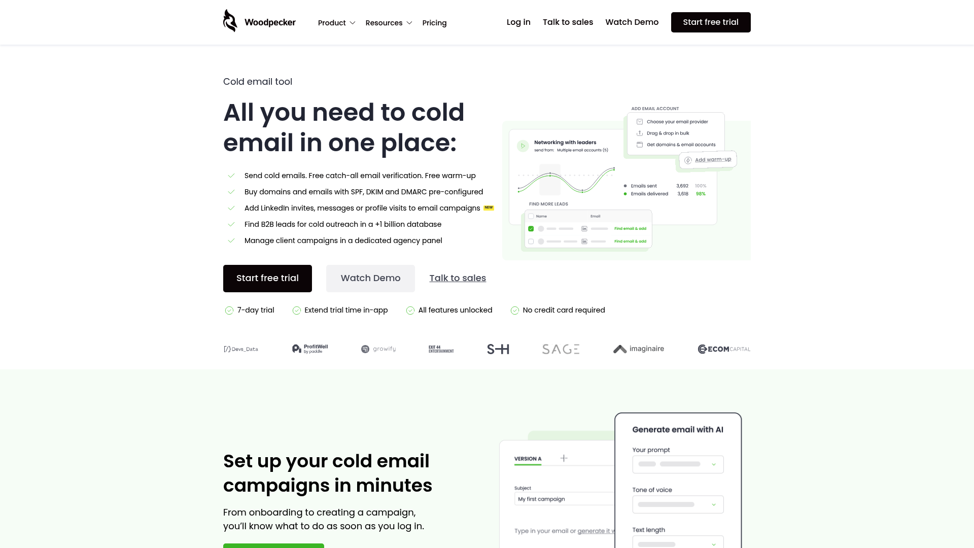 Woodpecker bietet eine 7-tägige Testphase (oder bis zu 50 Leads), in der alle Funktionen freigeschaltet sind. Die Preisgestaltung basiert auf monatlich kontaktierten Leads und dauerhaft gespeicherten Kontakten, was Flexibilität für wachsende Teams bietet.