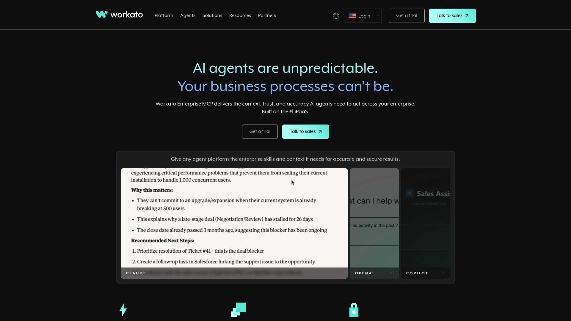Problem: Fragmented systems slow down work. Solution: Workato connects applications and orchestrates AI agents centrally. Result: Secure, scalable real-time automation.